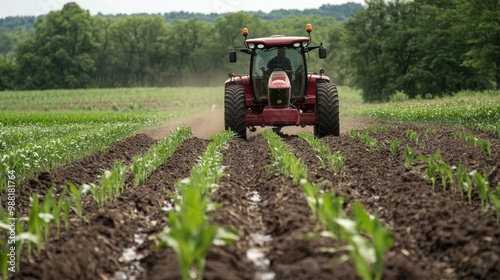 © Ndoomyim, Fototapeta premium Red Tractor Cultivating Corn Field in Summer