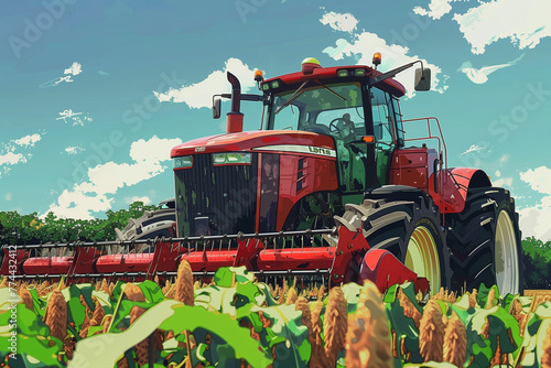 Obraz premium Red Tractor Driving Through Corn Field