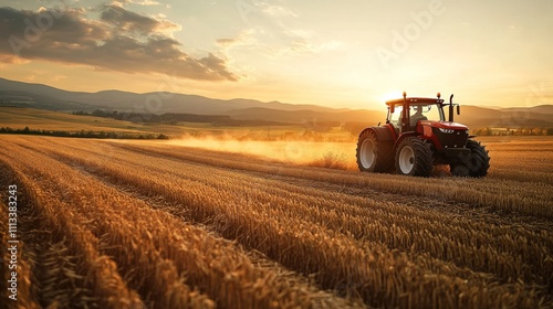 Fototapeta premium Red tractor driving through vast golden wheat field at sunset with mountains in background, conveying peacefulness and serenity