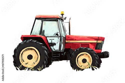 Fototapeta premium Red tractor illustration, farming equipment.