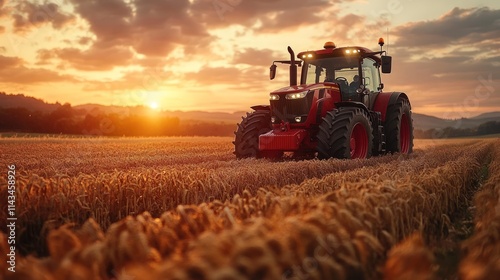 © Ali, Fototapeta premium Red tractor in golden sunset field.