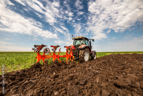 © oticki, Fototapeta premium Red tractor is engaged in plowing the soil in a vast green farmland under a cloudy sky