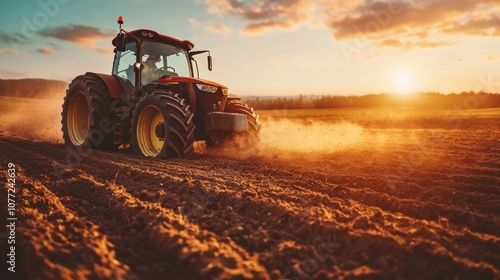 Obraz premium Red Tractor Moving Through A Field At Sunset