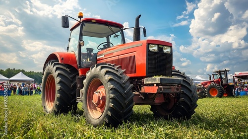 © Ben Kuang, Obraz premium Red tractor on a sunny day at an agricultural fair.