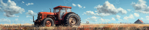 © Oleksandr Pokusai, Obraz premium red tractor operating in a golden wheat field under a bright sky with dramatic clouds. Generative ai vector illustration. Wide banner image