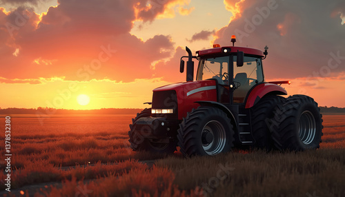 © Viktor, Fototapeta premium Red tractor parked on field in the sunset. Agricultural machine with big wheels, powerful equipment. Modern rural tech on harvest farmland with sky background.