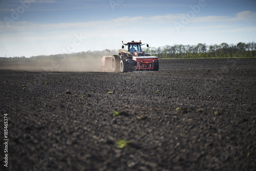 © PickOne, Obraz premium Red tractor plow field