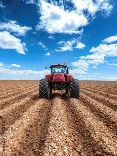 Fototapeta premium Red tractor plowing agricultural field under blue sky