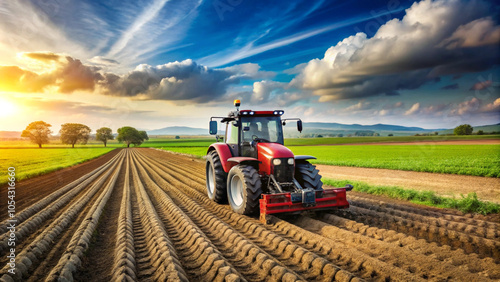 © ACHI, Obraz premium Red Tractor Plowing Field at Sunset