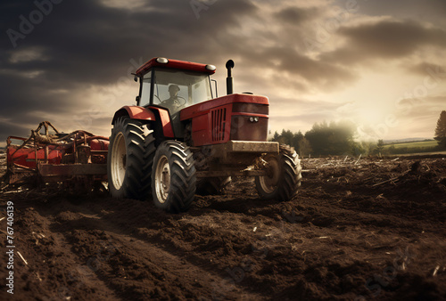 © Canvas Alchemy, Obraz premium Red tractor plowing field at sunset