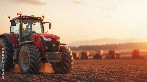 Obraz premium Red tractor plowing field at sunset, symbolizing modern agriculture and farm...