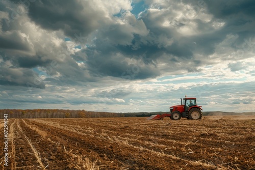 © Sandu, Obraz premium Red Tractor Plowing Field Under Dramatic Sky
