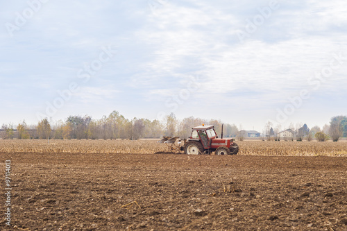 © Franco Nadalin, Obraz premium Red Tractor Plowing in Autumn