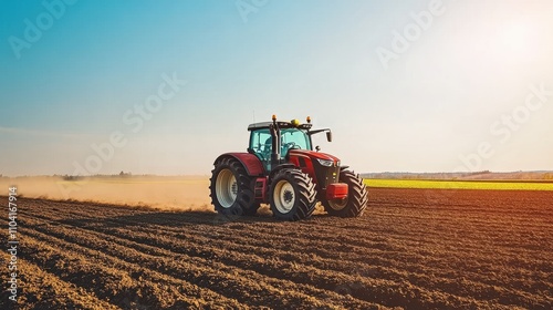 © Chinases, Fototapeta premium Red tractor plowing the field under a clear sky in the countryside during the day