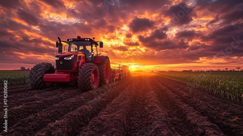 © RONNY, Fototapeta premium Red tractor plows field at fiery sunset