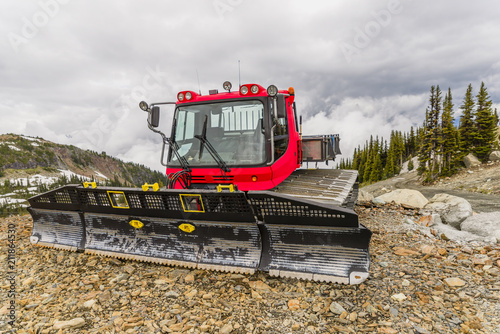 © Viktor Birkus, Fototapeta premium Red tractor, snow plough parked outside a mountain on the rocks