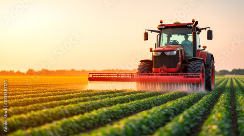 © Vertigo Images, Obraz premium Red tractor spraying crops at sunset.