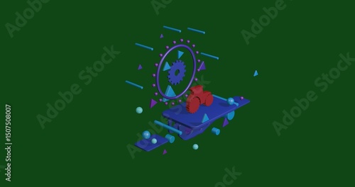 © Alexey, Obraz premium Red tractor symbol on a pedestal of abstract geometric shapes floating in the air. Abstract concept art with flying shapes in the center. 3d illustration on green background
