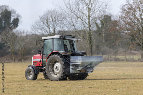 Obraz premium Red tractor with automatic lime spreader