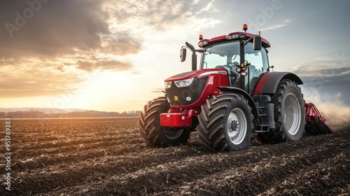 © Nas, Fototapeta premium Red Tractor Working Field at Sunset