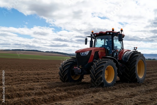 © fotofabrika, Fototapeta premium Red tractor working in a plowed field under a cloudy sky in early spring