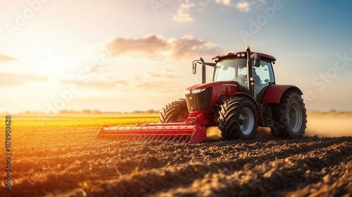 Fototapeta premium Red Tractor Working in Field at Sunset with Beautiful Sky