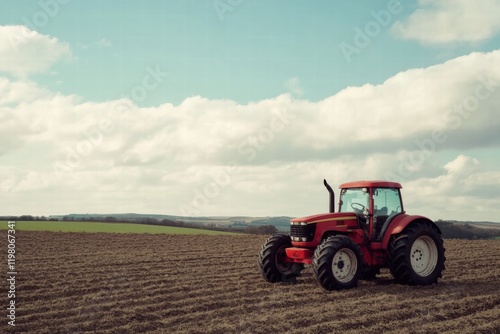 © Anat art, Obraz premium Red tractor working on a plowed field under a cloudy sky in a rural landscape. Generative AI