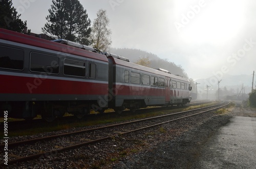 © oljasimovic, Fototapeta premium red train and foggy morning