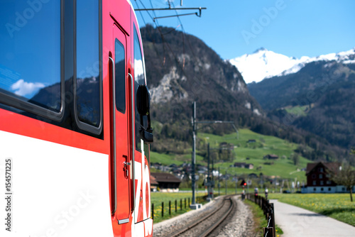 © buenafoto, Obraz premium Red train and hills. Swiss Alps