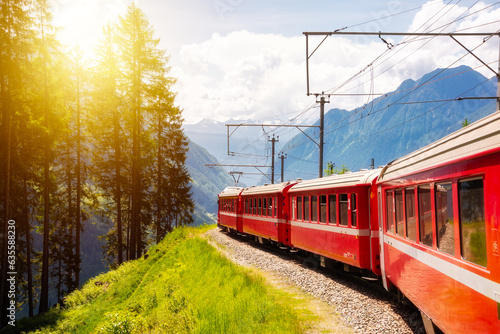 © Maresol, Naklejka premium Red train moving in beautiful green summer forest in Switzerland