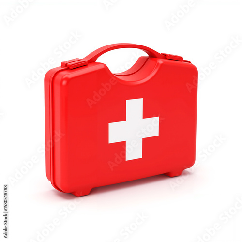 Obraz premium Red travel first aid kit in suitcase shape with handle on white background for safety concept
