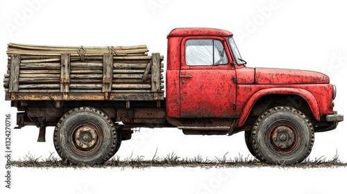 © SI3ee, Obraz premium Red Truck Loaded with Wood, Rural Scene
