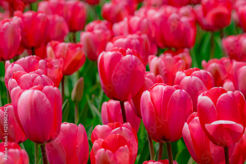 © Volodymyr, Fototapeta premium Red Tulip flower in tulip field at spring day. Colorful vivid pink tulips in the park. Spring landscape. Red tulip garden in spring. The Tulip. Beautiful bouquet of tulips in spring nature. Close up