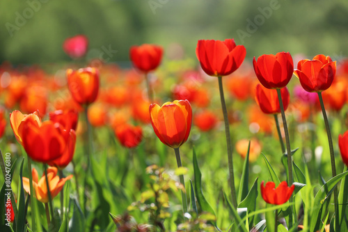 Fototapeta premium Red tulip flowers, spring background. Field of blooming tulips, selective focus