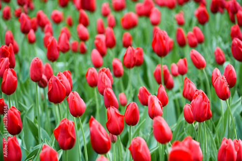 © Milan, Obraz premium Red tulip plant flowers in beautiful garden. Many blossom tulips in top view.