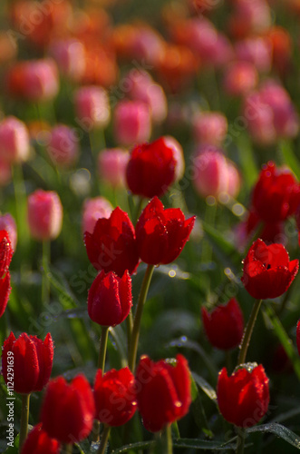 Obraz premium Red tulips bloom in a vibrant field of flowers, a breathtaking display of...