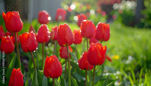 © Trio, Fototapeta premium Red tulips blooming in spring garden