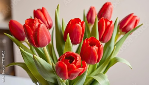 © awan toklo, Fototapeta premium Red tulips bouquet, close-up, home interior. Possible stock photo use