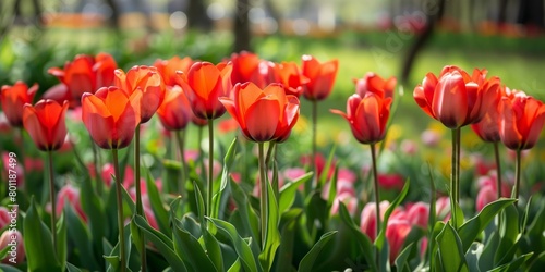 Fototapeta premium Red tulips growing in a park