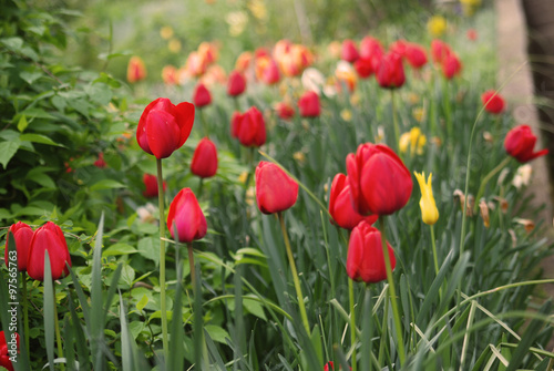 © bellakadife, Fototapeta premium Red tulips in a garden
