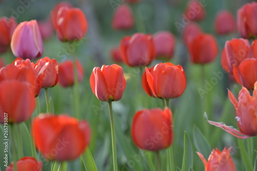 © yura2087, Obraz premium Red tulips in the home garden. Flowers in spring. April evening.