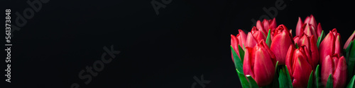 Fototapeta premium Red tulips isolated on a black background. Photo for card on Valentine's day, women's day, mother's day, birthday, name day. Background banner for website, panorama photo.