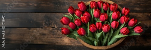 © shirophoto, Fototapeta premium Red tulips on a wooden background, top view. Spring flowers for Mother's Day or Women's Day with copy space. Happy women's and woman's greeting holiday concept.