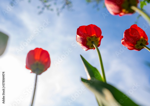 © tache, Obraz premium Red tulips on blue sky background. Springtime