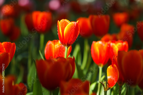 © khanunza, Fototapeta premium Red Tulips petals orange bud in blurry tulips background