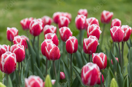 © Sergey, Fototapeta premium Red tulips with a white stripe in the park, detailed view.