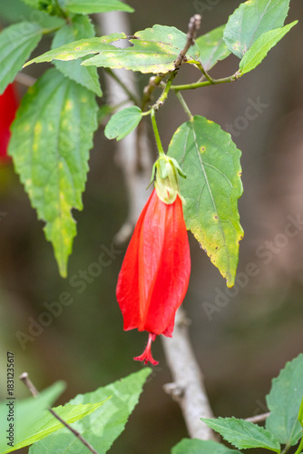 © niltonemaia, Fototapeta premium Red Turk's Cap flower (Malvaviscus arboreus) in vertical close-up. Framed by green foliage, with selective focus and bokeh. Nature, flora, ornamental.