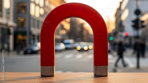 © MdNazim, Fototapeta premium Red U- Shaped on Wooden Surface with City Background