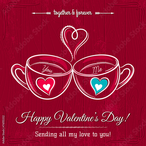 © sunnyfrog, Naklejka premium red valentine card with two cup of hot drink and wishes text, v