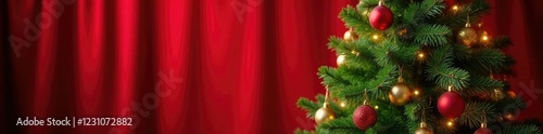 Fototapeta premium Red velvet backdrop with towering green Christmas tree and twinkling lights, ornaments, garland